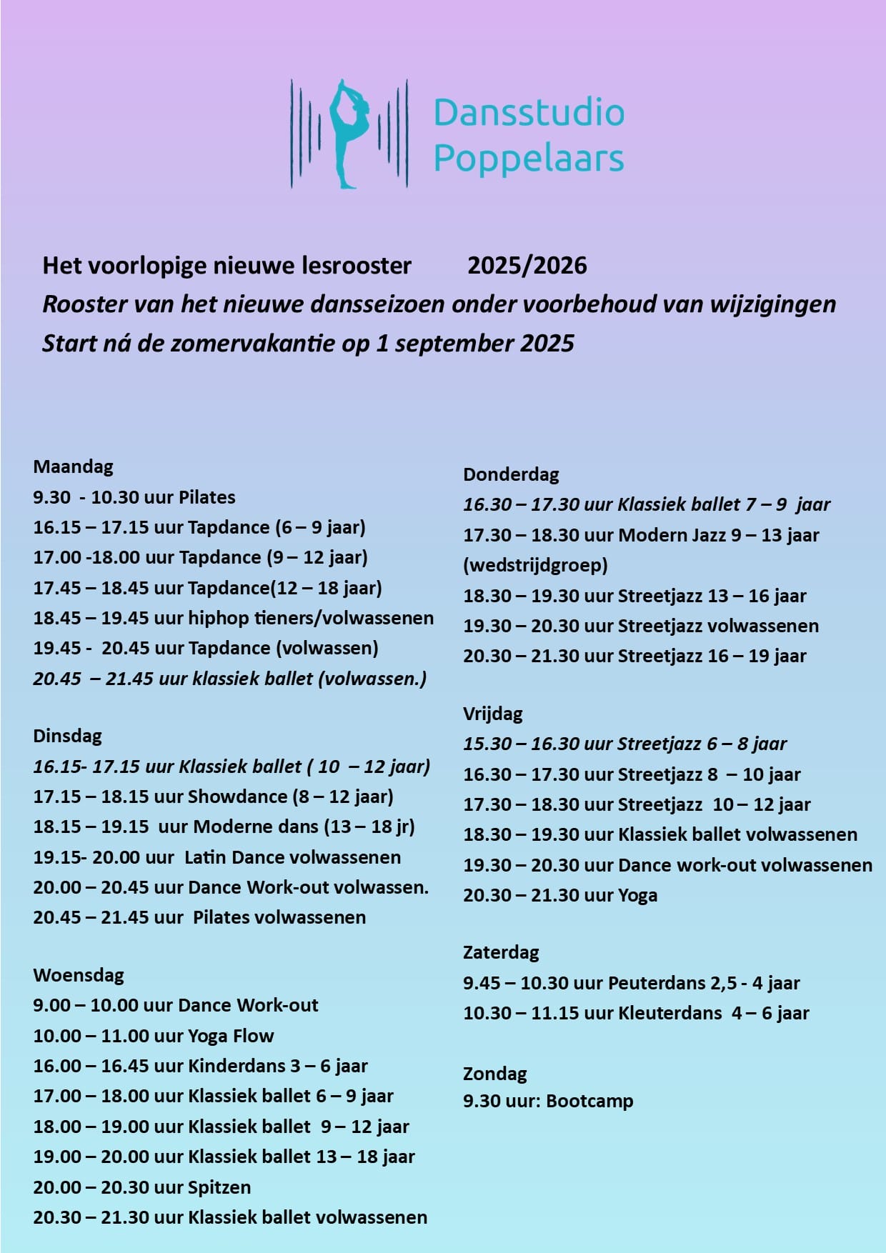 Hieronder vind je ons lesrooster van dansseizoen 2025/2026″. Dit seizoen loopt van 1 september 2025 tot 19 juli 2026.